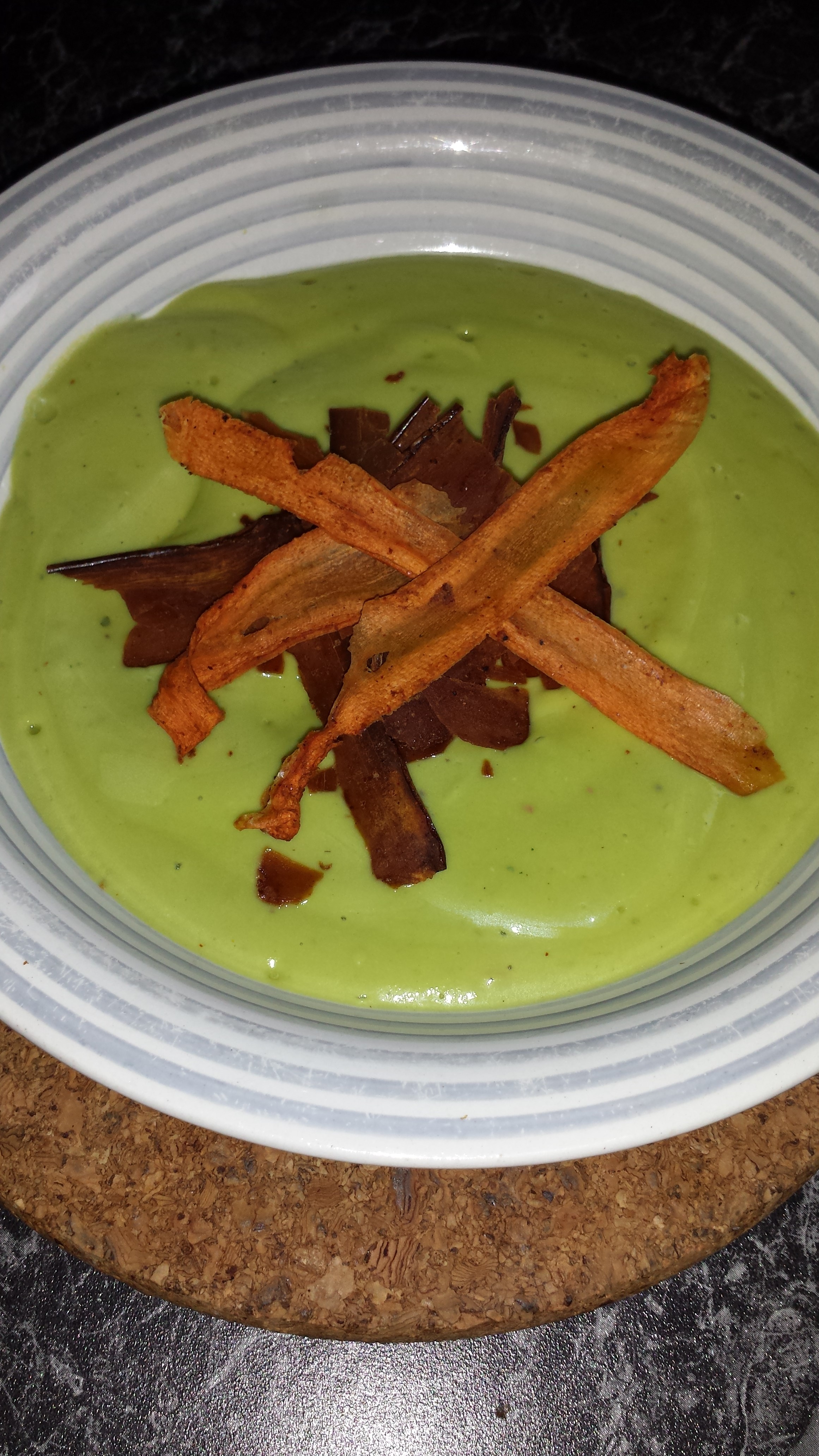 Gör så här för en portion: Mixa en stor/ två små avokados med 1 vitlöksklyfta, en klyfta citron, ca 2 dl mandelmjölk* (börja med en och öka till du tycker konsistensen är bra) och lite örtsalt. Toppa med något gott om du vill, t. ex morots och aubergine chips (morötter och aubergine som jag torkat i ugnen med olivolja och havssalt), groddar, bovetecrunch (torkade bovetegroddar), alger, paprikabitar, oliver, finrivna morötter, nötter, frön, flingsalt, svartpeppar, persilja.