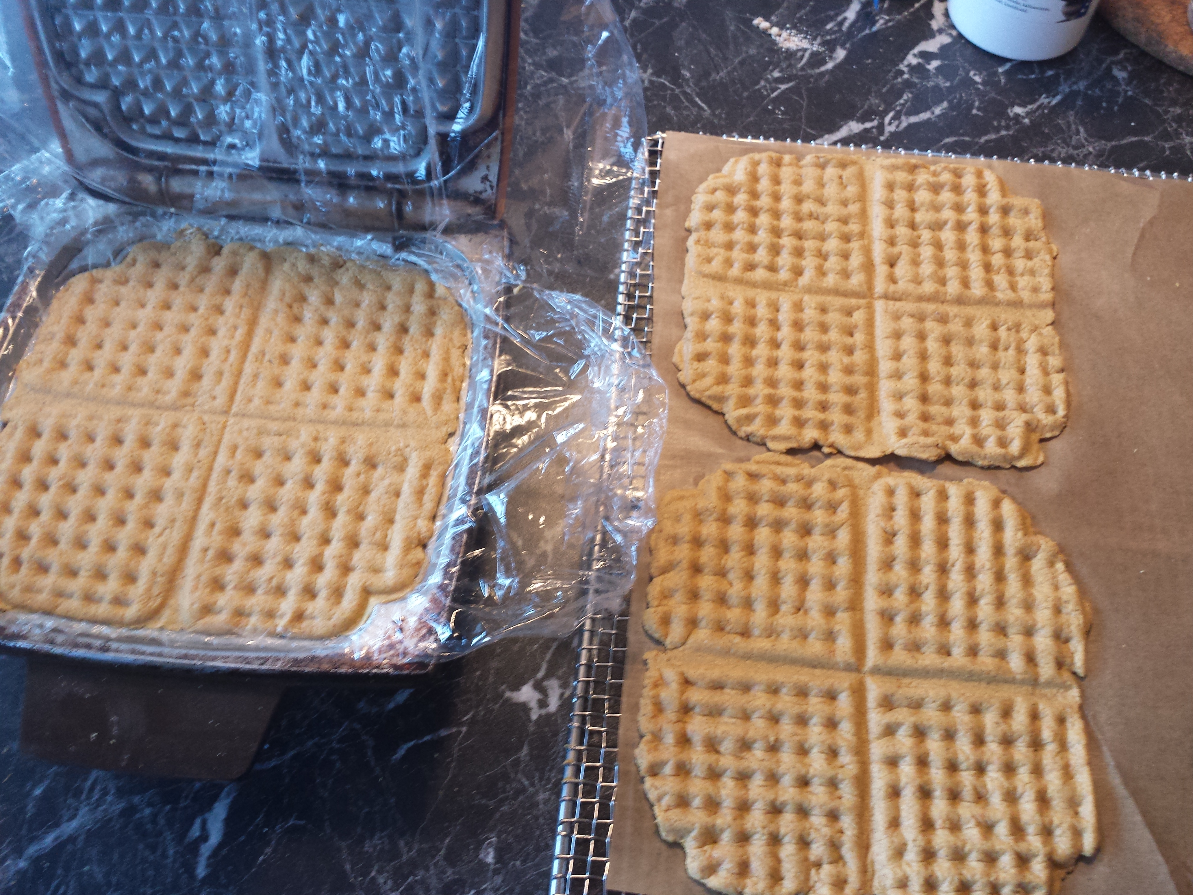 När du gjort alla våfflorna så sätter du in dem i torkugnen på 42 grader (eller vanlig ugn med varmluftseffekten/ luckan på glänt på lägsta temperatur) en timme, vänd dem sedan och torka ytterligare 1-3 timmar. Dem är godast att äta nygjorda eller att du värmer på dem lite ytterligare i torkugn innan servering.