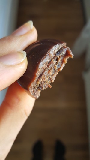 Börja med chokladen. Smält kakaosmöret försiktigt under ett vattenbad eller helst i ugn på 40 grader. Blanda det med övriga ingredienser och rör noga. Använd knappt ½ smeten och fyll 30 formar så det täcker 1/3 av formen ungefär, sätt in dem i frysen medans du gör fyllningen. Den gör du genom att blanda ihop 8 mjuka färska dadlar med resten av ingredienserna, i en matberedare eller med en gaffel går bra, när det är väl blandat klickar du i lite av fyllningen i varje form. Täck med resten av chokladsmeten. Låt stelna i kyl ett par timmar, men glöm inte ta ut dem minst 20 min innan du ska äta dem, för det är tusen gånger godare med choklad som inte är kylskåpskall. Har du under 22 grader hemma är det därför bättre att förvara dem i en burk i rumstemperatur.