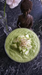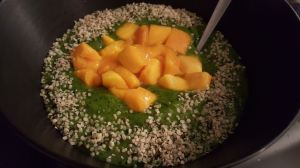 5. Något krämigt: Vem gillar inte en krämig smoothie? Ha nu i lite avokado (avokado är lätt att överdosera, det räcker med ½), gryn/blötlagt bovete (ca ½- 1 dl), nötsmör eller nötter/frön (1-3 msk), tofu (ca 1 dl), eller havre/soja/nötyoghurt och frukter som ger krämighet t. ex mango och banan. Mängden på yoghurt och mango/banan går inte riktigt att överdosera på samma sätt som de andra ingredienserna jag räknade upp. Börja med 1-2 dl och ha i mer efterhand beroende på hunger och hur du vill ha din smoothie.