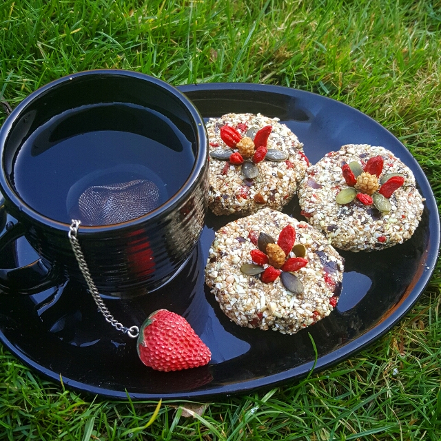 Forma nu till 4 kakor med händerna, toppa ev. med gojibär, mullbär, och pumpafrön för en liten vacker dekoration (kolla i videon hur jag gör för att det ska bli som en blomma).