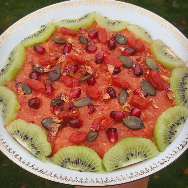 Kör alla ingredienser slätt och fint i en mixer eller matberedare. Toppa med gojibär, pumpafrön och granatäpplekärnor.