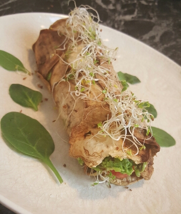 Mixa ihop ingredienserna till röran i en matberedare, kör inte för länge, den ska vara lite ”chunky”, lite textur är gott! Bre sedan röran över aubergin ”brödet”, lägg på valfria grönsaker och rulla försiktigt ihop!