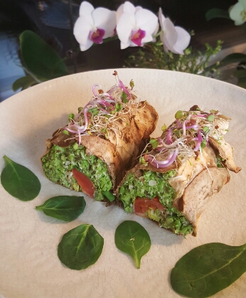 Vad är det som vi älskar med wraps? Förmodligen är det inte brödet i sig, det är sättet att äta på. Vi gillar att äta med hjälp av händerna helt enkelt. Poängen med wraps är egentligen inte att brödet ska vara i centrum, utan mer fyllningen, wraps är alltid saftiga och har mycket fyllning i förhållande till bröd. De här receptet är en perfekt kombination av raw bröd, som inte ens är bröd, utan bara liknelsen, konsistensen och som formar rätten tillsammans med en super god röra på gröna ärtor med en härlig textur och god smak med hjälp av pumpafrön. Resten av ingredienserna är valfria, gå loss i grönsaksdisken och nappa åt dig alla möjliga färger, texturer och smaker, så är vi framme!