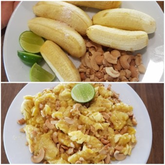Det här receptet väcker härliga minnen från Thailand! Det är nämligen i Thailand som detta receptet skapades (du kan se i videon nedan när jag gör receptet på frukost buffén på hotellet!). I Thailand har dem fantastiska bananer, otroligt goda limefrukter och färska supergoda cashewnötter, det är självklart att detta smakar magiskt ihop! Om du nu skulle vilja testa detta i Sverige så blir det lite svårt att få till de där perfekta smakerna eftersom vi inte har den kvalitén på råvarorna, men det finns en lösning på ett recept som ändå blir otroligt gott som jag skriver de perfekta proportionerna på här nedan. För att se exakt hur du gör den här fantastiska ”äggröran”, kolla gärna in videon!