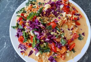 – Valfria groddar, min favorit är bovetegroddar eftersom dom är matiga och lite kaloririkare, annars funkar alla groddar! Har man inte groddar kan man ta kikärtor, linser, bönor, tofu eller tempehbitar istället, men då blir det inte helt raw, men fortfarande väldigt gott och hälsosamt.