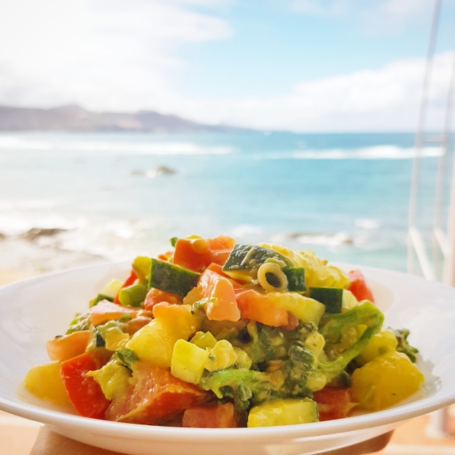 Den här tropiska salladen gjorde jag första gången på Gran Canaria i lägenheten jag bodde i. Jag ville skapa något fantastiskt med de goda färska råvarorna som fanns tillgängligt. Jag kan vara helt ärlig och säga att de bästa som finns är om man kan göra den här salladen i ett tropiskt klimat men faktiskt så blir den god om man köper ingredienserna i Sverige också. Får man inte tag på bra färska råvaror så finns det bra kvalité i frysdisken som du kan hålla utkik efter!