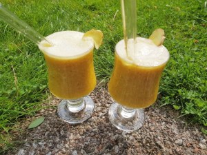 Riv de yttre orangea skalet från apelsinen direkt ner i mixern, men använd bara 1/4 av skalet från en apelsin eftersom det annars kan bli för starkt. Pressa apelsinen för hand och häll ner i mixern, vänd gärna ner fruktköttet också. Man kan även lägga i hela apelsinen (när du skalat den), men då behövs en stark mixer. Med hela apelsinen blir det en något tjockare dryck samt att vissa av bitterämnena från hinnorna av apelsinen kommer med. Mixa alla ingredienser tills det är helt slätt. Förvara drycken i kylskåpet eller drick direkt. Drycken är bäst att dricka upp inom 2 dagar om du inte dricker direkt.