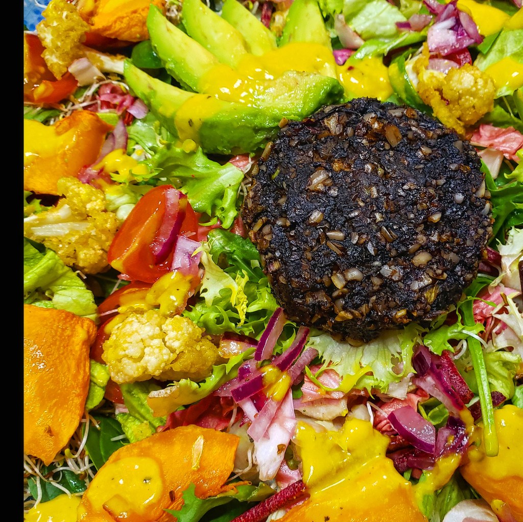 Det här är något för dig som älskar burgare. Den veganska svampburgaren har all umami man kan önska sig och ett riktigt djup i smaken! Så god att att äta enbart haha, men alltså man behöver inte mycket mer smaker i en måltid! Liksom perfekt att äta med endast gurka, tomat och avokado utan extra kryddor eller såser. Men ja, testa den här burgaren med klassiska tillbehör, burgarbröd, pickles, mayo, tomat etc…eller addera den till en sallad, liksom som på bilden. Eller till vilken måltid som helst när du vill ha ett riktigt bra veganalternativ till kött!