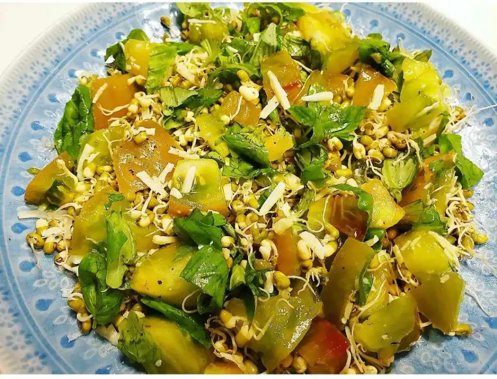 Genom att byta ut pastan till mungbönsgroddar får en härlig textur i salladen, en kraftfullare smak och mer näring, win-win! Tackvare oljan får groddarna en mjukare mer lättäten struktur och citronen fräschar upp allt i sin perfektion! Vitlöken är där och när osten tillsätts också så får du en perfekt balans i smaker och behöver inga mer dressing-ingredienser, inte ens salt! När man har så smakrika råvaror i sig krävs inte mycket ingredienser! Försök hitta mogna tomater och köp gärna ekologisk basilika eftersom den har mer smak. Om du hittar basilika av sorten Genovese- go for it!!! Den är den godaste om man nu ska gå in på nördnivå!