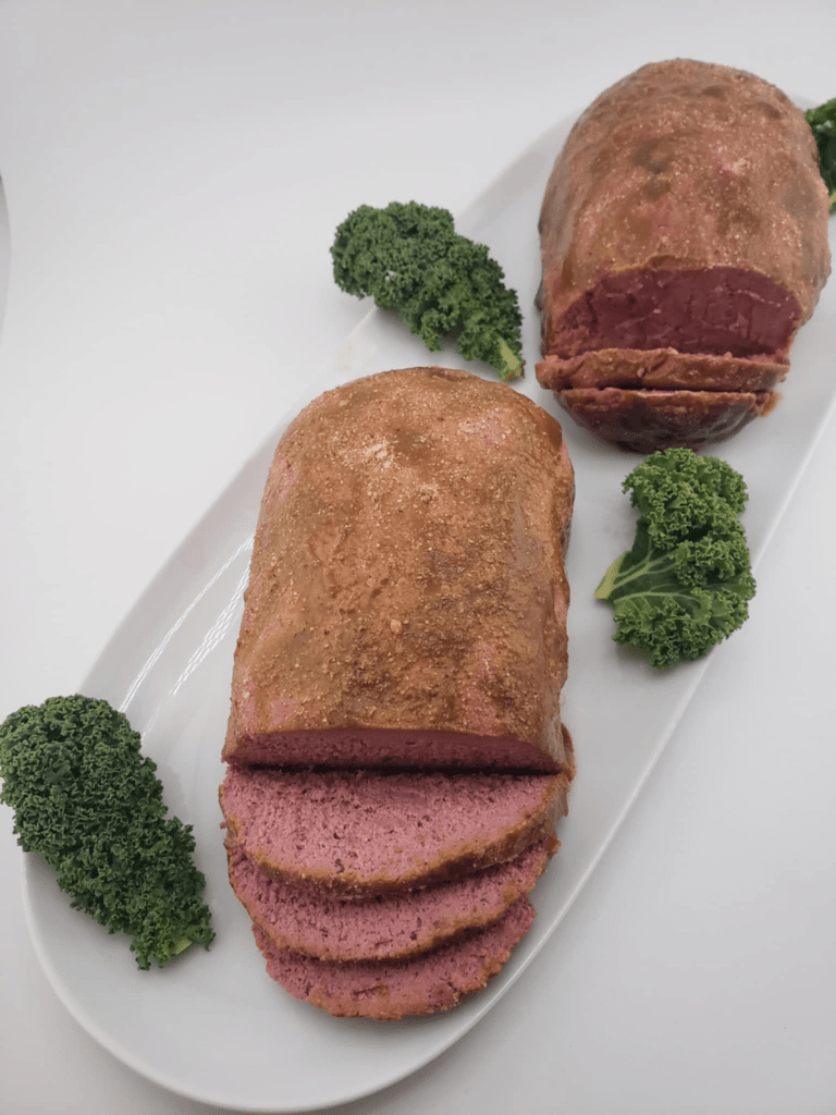 Lägg ”skinkan” hel på ett fat med grönkål, apelsinklyftor och kanske några hela rödbetor runtom för tydlig julkänsla. Skär skivor vid bordet som med en vanlig julskinka.